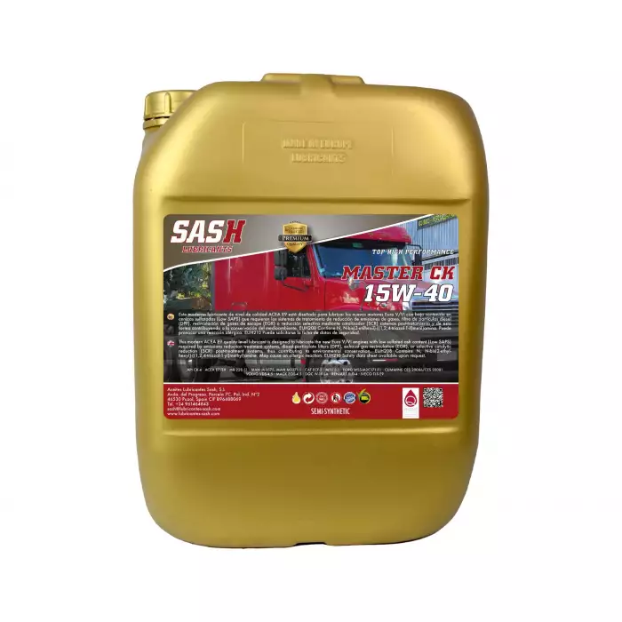 Автомобільна моторна олива SASH MASTER CK 15W40 відповідає класу якості ACEA E9. Його формула розроблена для двигунів Euro V/VI з вимогами до низького рівня сульфатної золи (Low SAPS). Воно призначене для використання в моторах, оснащених технологіями очищення вихлопних газів, включаючи сажові фільтри DPF, системи рециркуляції EGR і установки селективної каталітичної нейтралізації SCR. Застосування цього продукту підтримує функціонування даних систем, що сприяє дотриманню екологічних норм.